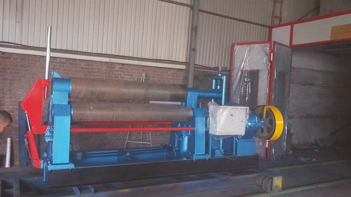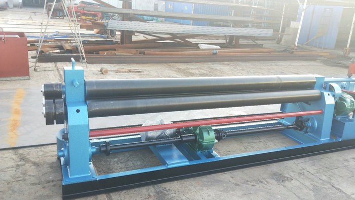 液壓下拉式卷板機(jī)主要特點(diǎn):該機(jī)上輥可以垂直升降,垂直升降的液壓傳動(dòng),通過液壓缸內(nèi)的液壓油作用活塞桿而獲得;下輥?zhàn)餍D(zhuǎn)驅(qū)動(dòng),通過減速機(jī)輸出齒輪嚙合,為卷板提供扭矩,下輥下部有托輥,并可調(diào)節(jié)。上輥呈鼓形狀,提高制品的直線度,適用于超長規(guī)格各種截面形狀罐。